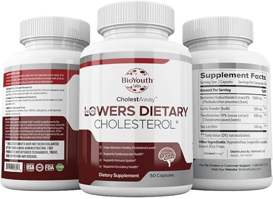 BioYouth Natural Cholesterol Lowering Support Supplement for Adults - Nutritious Blend of Garlic, Berberine, Coca Extract & Soy Lecithin - 60 Capsules